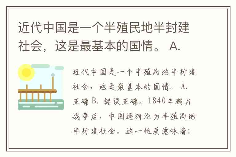 近代中国是一个半殖民地半封建社会,这是最基本的国情。 A. 正确 B. 错误