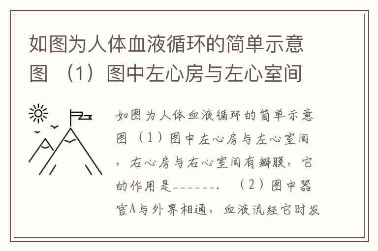 如图为人体血液循环的简单示意图 (1)图中左心房与左心室间,右心房与右心室间有瓣膜,它的作用是______. (2)图中器官A与外界相通,血液流经它时发生气体交换,它是人体呼吸系统最重要的器官,这个器官是______. (3)如果B是小肠,则饭后血液流经B后,血液中葡萄糖的含量会______. (4)血液由右心室经A回到左心房这一过程称为______循环. (5)若某人牙龈发炎,静脉注射青霉素,青霉素最先到达心脏的哪一部分?______.