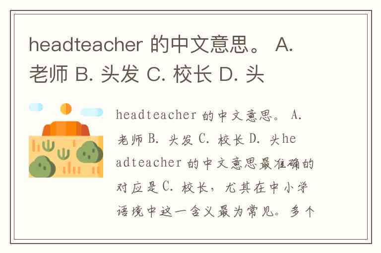 headteacher 的中文意思最准确的对应是 C. 校长,尤其在中小学语境中这一含义最为常见。多个词典和教育资料明确将其定义为“中小学的校长”,例如英国教育体系中常用该词指代学校负责人。不过需注意,在部分语境(如中国部分教材或日常对话)中,它也可能被理解为“班主任”,这种差异源于教育体系对“学校管理者”和“班级管理者”的不同划分。