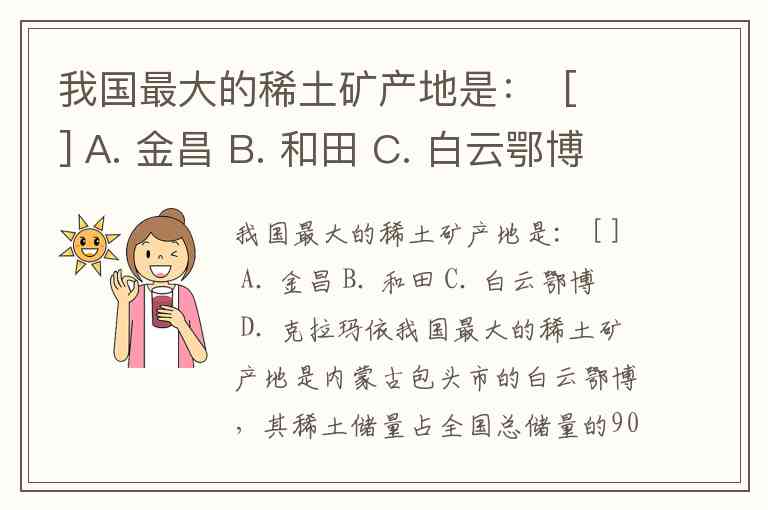我国最大的稀土矿产地是: [ ] A. 金昌 B. 和田 C. 白云鄂博 D. 克拉玛依