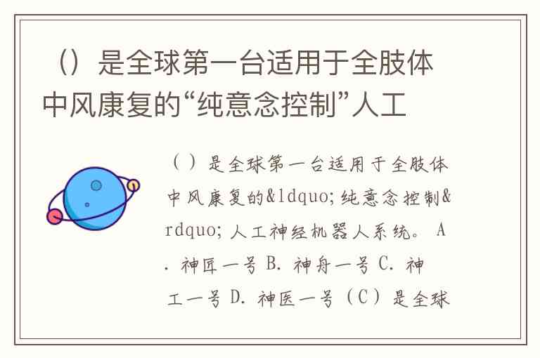 ()是全球第一台适用于全肢体中风康复的“纯意念控制”人工神经机器人系统。 A. 神匠一号 B. 神舟一号 C. 神工一号 D. 神医一号