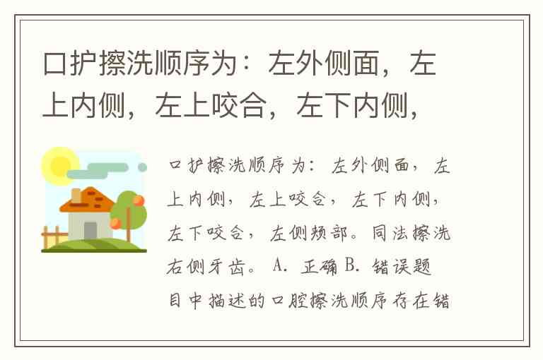 口护擦洗顺序为:左外侧面,左上内侧,左上咬合,左下内侧,左下咬合,左侧颊部。同法擦洗右侧牙齿。 A. 正确 B. 错误