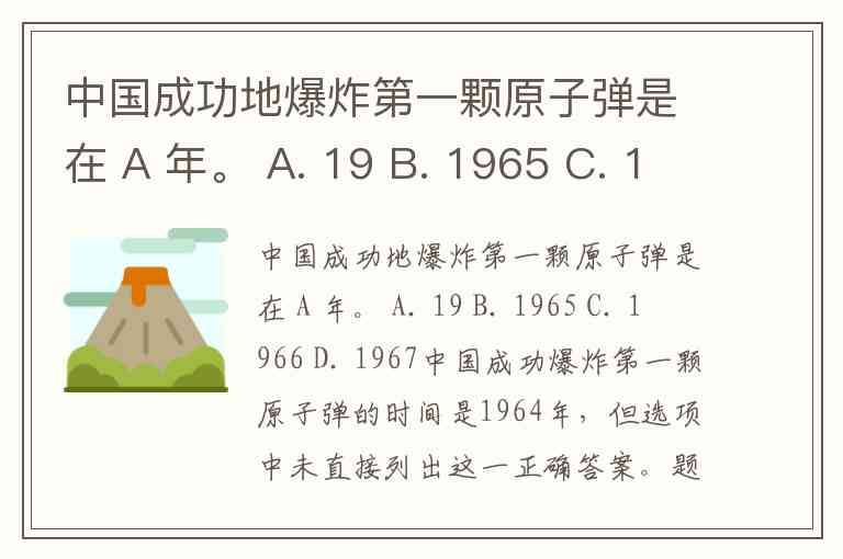中国成功地爆炸第一颗原子弹是在 A 年。 A. 19 B. 1965 C. 1966 D. 1967