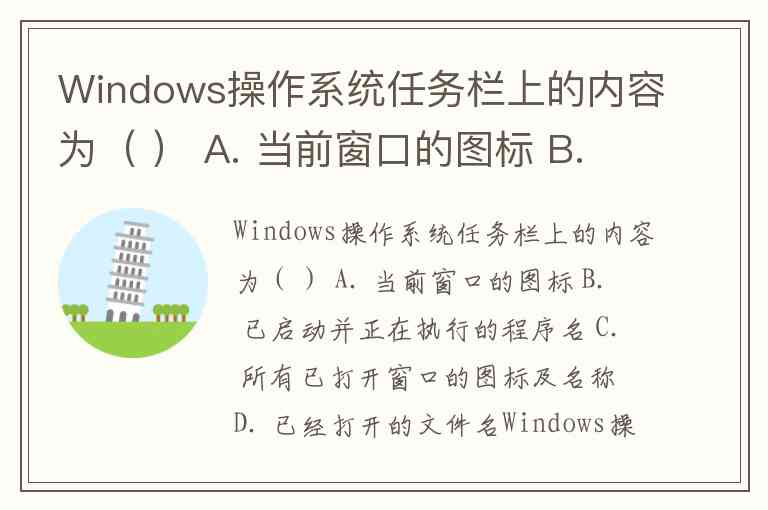 Windows操作系统任务栏上的内容为( ) A. 当前窗口的图标 B. 已启动并正在执行的程序名 C. 所有已打开窗口的图标及名称 D. 已经打开的文件名