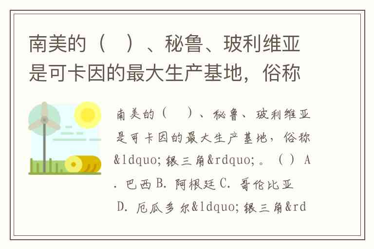 南美的( )、秘鲁、玻利维亚是可卡因的最大生产基地,俗称“银三角”。() A. 巴西 B. 阿根廷 C. 哥伦比亚 D. 厄瓜多尔