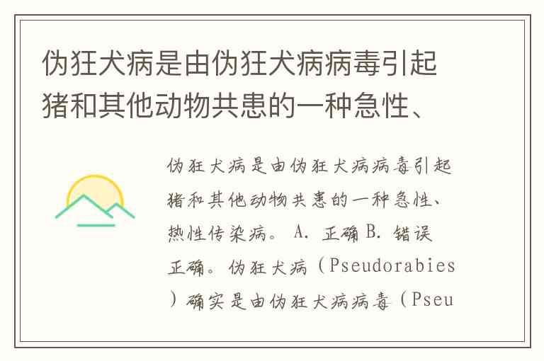 伪狂犬病是由伪狂犬病病毒引起猪和其他动物共患的一种急性、热性传染病。 A. 正确 B. 错误