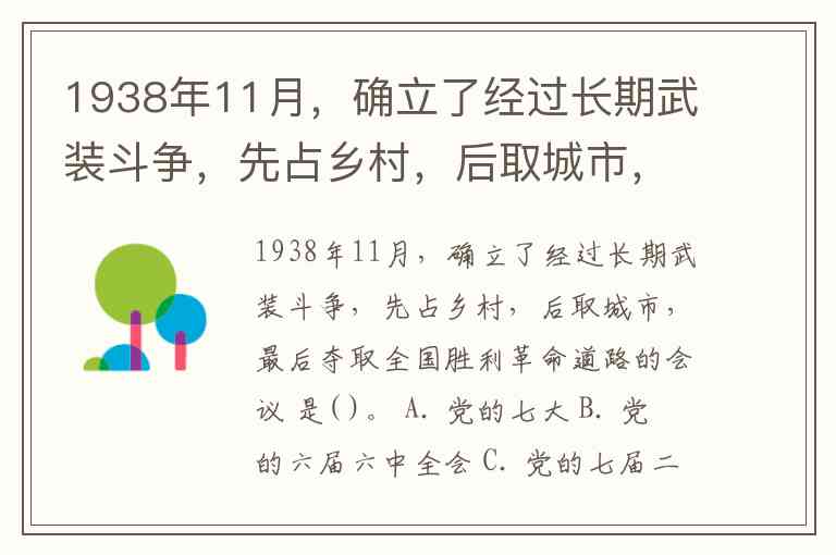 1938年11月,确立了经过长期武装斗争,先占乡村,后取城市,最后夺取全国胜利革命道路的会议 是( )。 A. 党的七大 B. 党的六届六中全会 C. 党的七届二中全会 D. 遵义会议