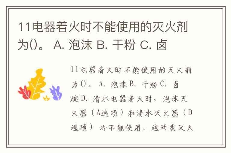 11电器着火时不能使用的灭火剂为()。 A. 泡沫 B. 干粉 C. 卤烷 D. 清水