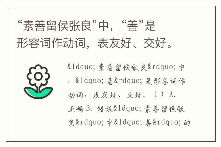 “素善留侯张良”中“善”的用法分析需结合文言文词类活用规则。“素”为副词“一向”,“善”后接宾语“留侯张良”,而形容词不能带宾语,故“善”在此处由形容词“好的”活用为动词,意为“与……交好”,符合形容词作动词的语法特征。