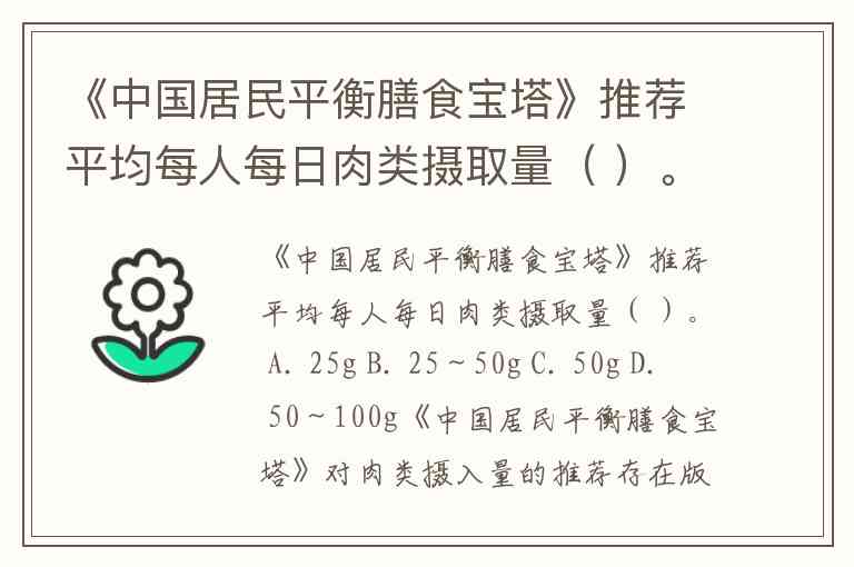 《中国居民平衡膳食宝塔》推荐平均每人每日肉类摄取量( )。 A. 25g B. 25~50g C. 50g D. 50~100g