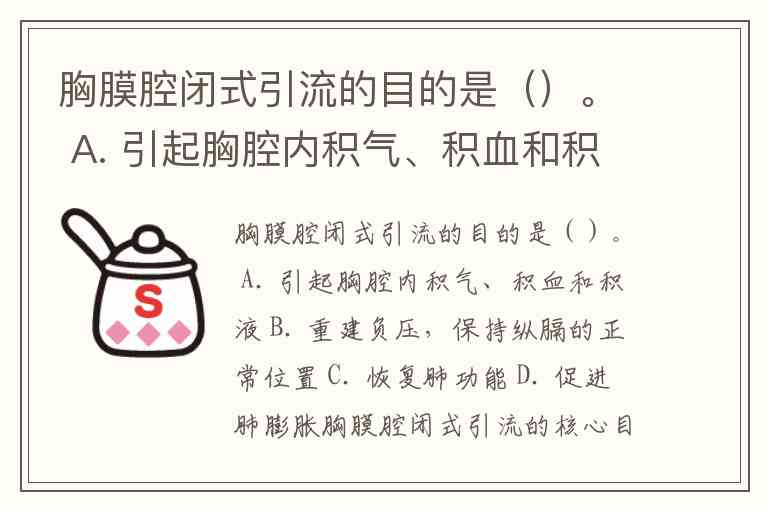 胸膜腔闭式引流的目的是()。 A. 引起胸腔内积气、积血和积液 B. 重建负压,保持纵膈的正常位置 C. 恢复肺功能 D. 促进肺膨胀
