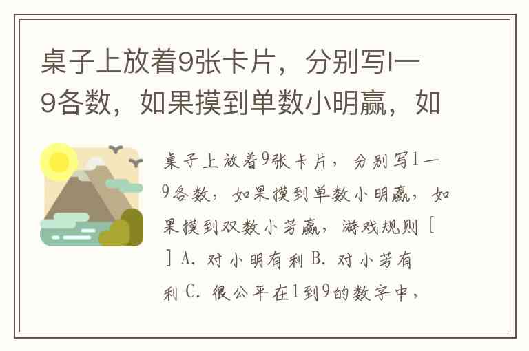 桌子上放着9张卡片,分别写l一9各数,如果摸到单数小明赢,如果摸到双数小芳赢,游戏规则 [ ] A. 对小明有利 B. 对小芳有利 C. 很公平