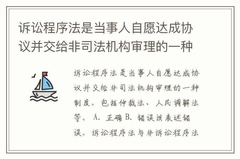 诉讼程序法是当事人自愿达成协议并交给非司法机构审理的一种制度。包括仲裁法、人民调解法等。 A. 正确 B. 错误