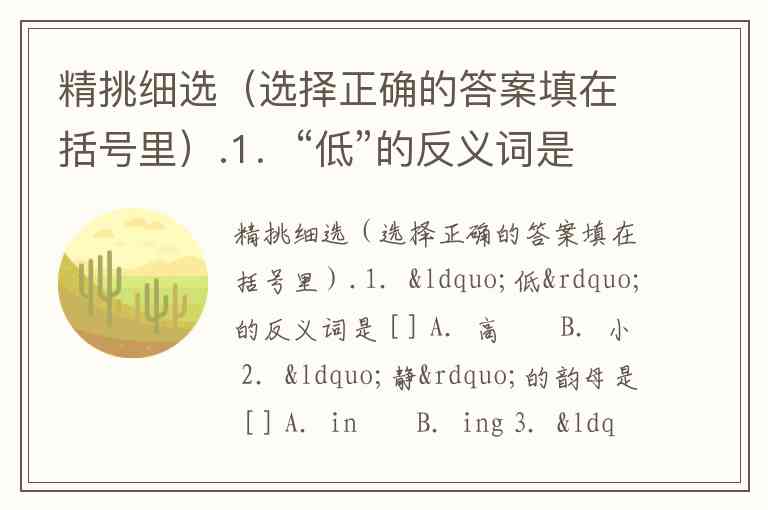 精挑细选(选择正确的答案填在括号里).1.“低”的反义词是 [ ] A.高 B.小 2.“静”的韵母是 [ ] A.in B.ing 3.“故”的部首是 [ ] A.古 B.攵 4.“光”的读音是 [ ] A.guān B.guāng