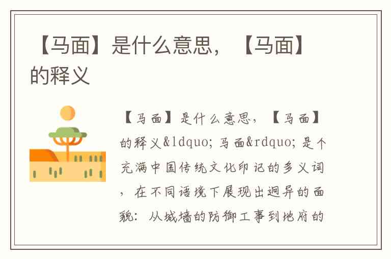 “马面”是个充满中国传统文化印记的多义词,在不同语境下展现出迥异的面貌:从城墙的防御工事到地府的勾魂使者,从古人的面相描述到现代复兴的汉服元素,它的每一种含义都承载着独特的历史文化信息。