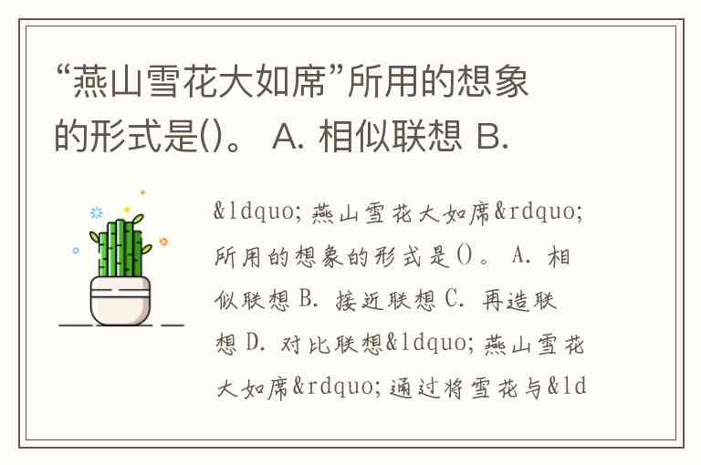 “燕山雪花大如席”所用的想象的形式是()。 A. 相似联想 B. 接近联想 C. 再造联想 D. 对比联想