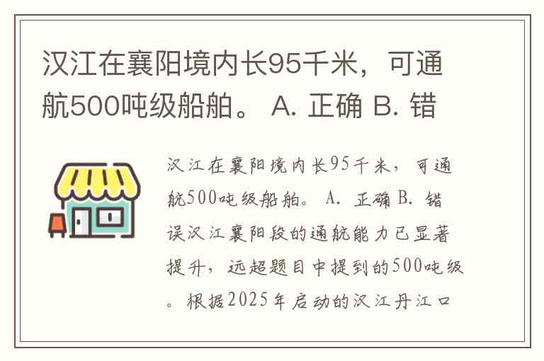 汉江襄阳段的通航能力已显著提升,远超题目中提到的500吨级。根据2025年启动的汉江丹江口至襄阳段整治工程,该段航道全长101公里,按Ⅲ级航道标准建设,完工后可通航1000吨级货船及驳船组成的船队。而襄阳以下的航道通过雅口枢纽二线船闸等工程,通航能力将进一步提升至3000吨级。即使在2023年,汉江襄阳段的通航能力也已达到千吨级,如雅口至上游崔家营段形成了52.67公里的千吨级航道。因此,题目中“可通航500吨级船舶”的说法已不符合当前实际情况,答案为B. 错误。