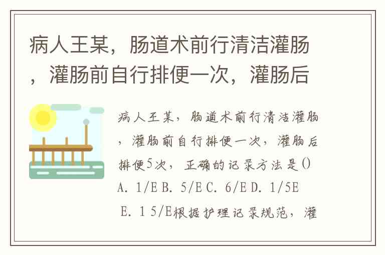 实际临床记录中,完整表述应为“1 5/E”(灌肠前1次+灌肠后5次),但本题选项中仅B符合灌肠后记录规范。这一记录方式通过“E”符号区分灌肠与自主排便,帮助医护人员快速判断肠道准备效果,是围手术期护理质量的重要评估依据。