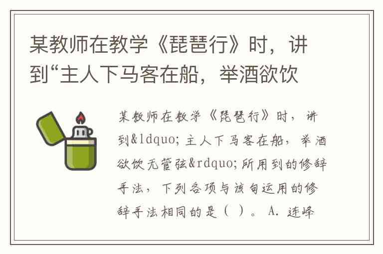 某教师在教学《琵琶行》时,讲到“主人下马客在船,举酒欲饮无管弦”所用到的修辞手法,下列各项与该句运用的修辞手法相同的是( )。 A. 连峰去天不盈尺,枯松倒挂倚绝壁。 B. 烟笼寒水月笼沙,夜泊秦淮近酒家。 C. 忽闻水上琵琶声,主人忘归客不发。 D. 嘈嘈切切错杂弹,大珠小珠落玉盘。