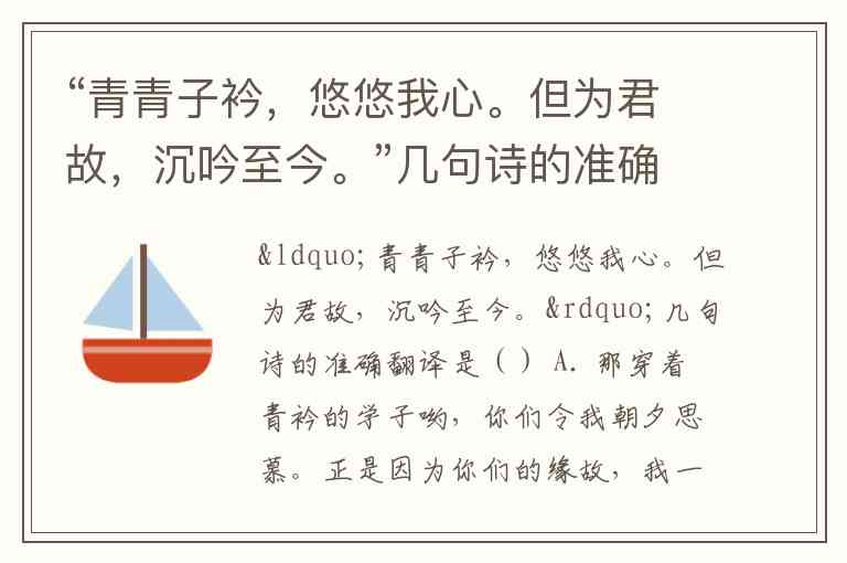 “青青子衿,悠悠我心。但为君故,沉吟至今。”几句诗的准确翻译是() A. 那穿着青衿的学子哟,你们令我朝夕思慕。正是因为你们的缘故,我一直低唱着《子衿》歌。 B. 那美丽的青衿哟,长久地缠绕在我的心头,只是为了你的缘故,让我至今沉吟。 C. 那些学子贤才们啊,你们令我朝夕思慕,就是为了你的缘故,让我一直沉吟。 D. 那位穿着青衿的学子哟,你令我朝夕思慕。正是因为你的病故,让我痛苦至今。