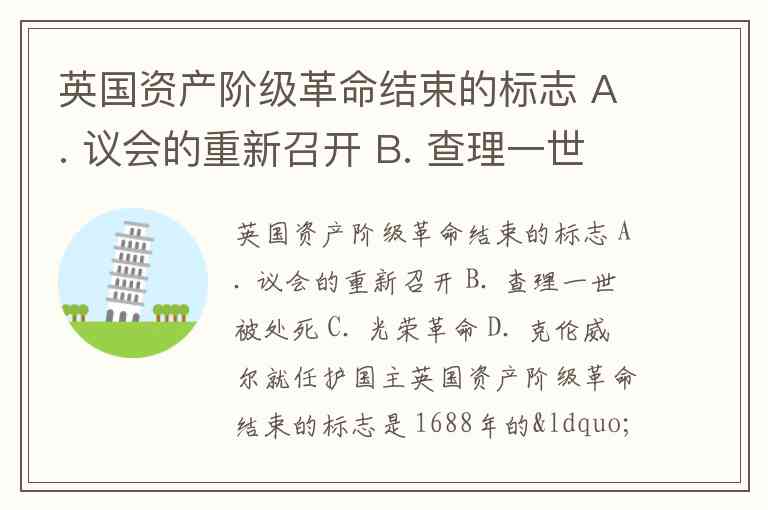英国资产阶级革命结束的标志 A. 议会的重新召开 B. 查理一世被处死 C. 光荣革命 D. 克伦威尔就任护国主
