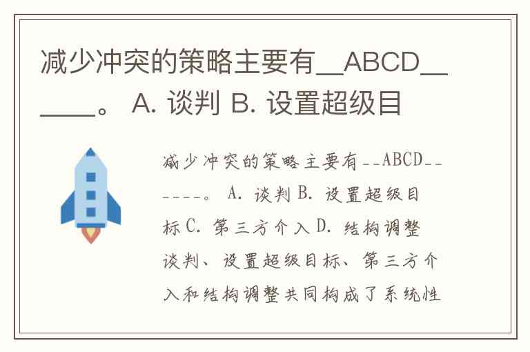 减少冲突的策略主要有__ABCD______。 A. 谈判 B. 设置超级目标 C. 第三方介入 D. 结构调整