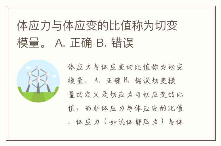 因此,题目中的表述混淆了“切变”与“体积”两种不同的物理概念,答案应为B. 错误。这一区别在工程实践中至关重要,例如机械设计中需用切变模量评估材料抗剪切失效能力,而建筑地基沉降分析可能涉及体积模量的应用。