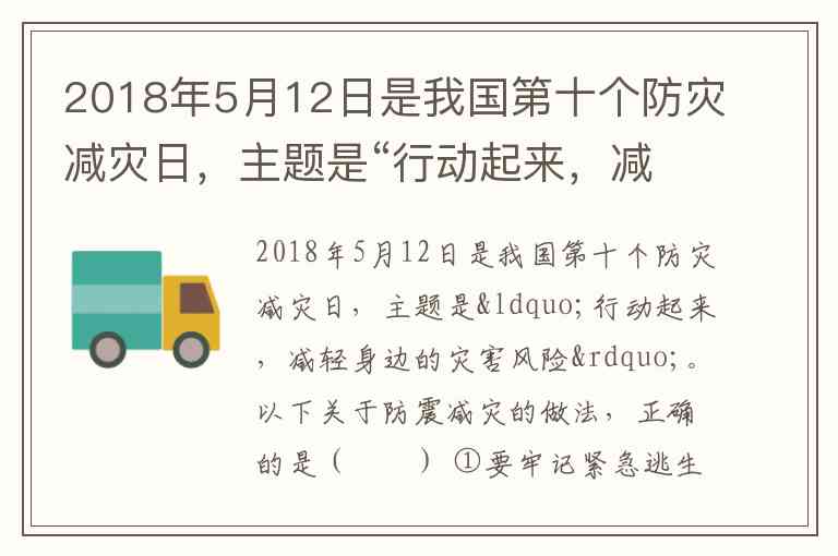 2018年5月12日是我国第十个防灾减灾日,主题是“行动起来,减轻身边的灾害风险”。以下关于防震减灾的做法,正确的是( ) ①要牢记紧急逃生路线及附近安全疏散地 ②准备家庭地震应急包,放在便于取到之处 ③发生地震时不要慌乱,尽可能关闭电、火、煤气 ④地震躲藏时要牢记“蹲下、藏身、抓牢”三要素 ⑤避开高大建筑物、立交桥等,可迅速躲在广告牌、树等下面 ⑥撤离时要保护好头部,不要翻窗、跳楼,可乘坐电梯迅速逃离 A. 1345 B. 1256 C. 1234 D. 3456
