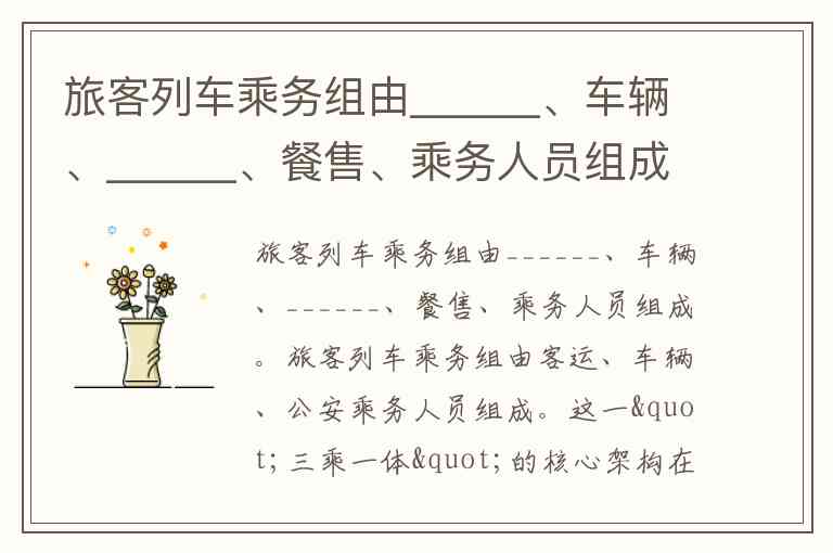 需要注意的是,题目中提及的"餐售"人员通常隶属于客运乘务体系,属于服务职能的延伸而非独立模块。这种架构设计是否适应未来智能化列车的发展需求,比如是否需要增设专职技术督导岗位,值得进一步探讨。
