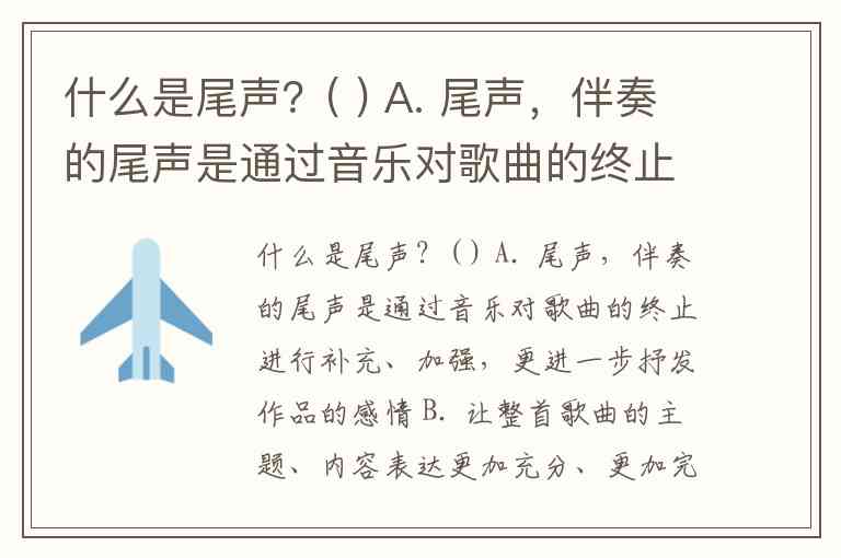 什么是尾声?( ) A. 尾声,伴奏的尾声是通过音乐对歌曲的终止进行补充、加强,更进一步抒发作品的感情 B. 让整首歌曲的主题、内容表达更加充分、更加完美。 C. 可以是灿烂辉煌地,也可以是意味深长地,根据乐曲不同的风格特点可以编配不同的尾声 D. 幼儿歌曲弹唱的尾声大多短小而精炼