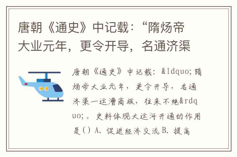唐朝《通史》中记载:“隋炀帝大业元年,更令开导,名通济渠一运漕商旅,往来不绝”。史料体现大运河开通的作用是( ) A. 促进经济交流 B. 提高造船技术 C. 结束分裂局面 D. 便利巡游玩乐