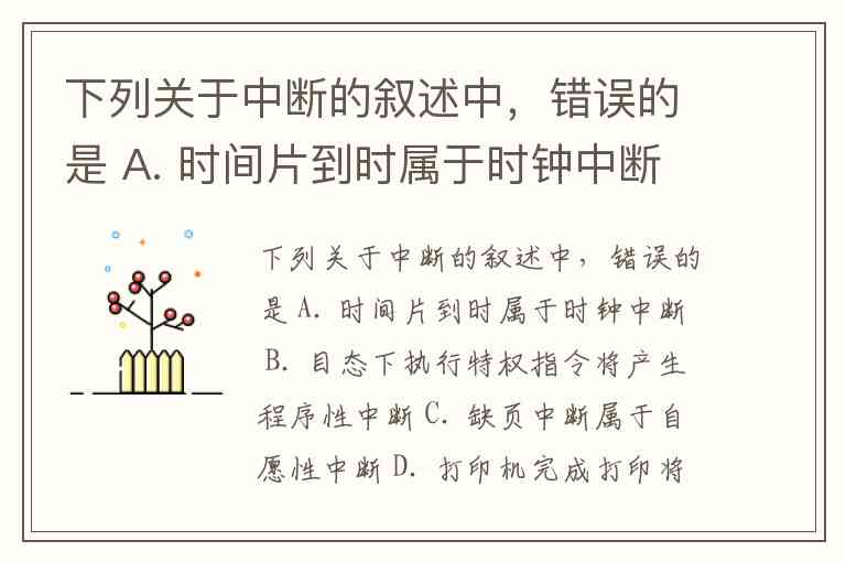 下列关于中断的叙述中,错误的是 A. 时间片到时属于时钟中断 B. 目态下执行特权指令将产生程序性中断 C. 缺页中断属于自愿性中断 D. 打印机完成打印将产生输入输出中断