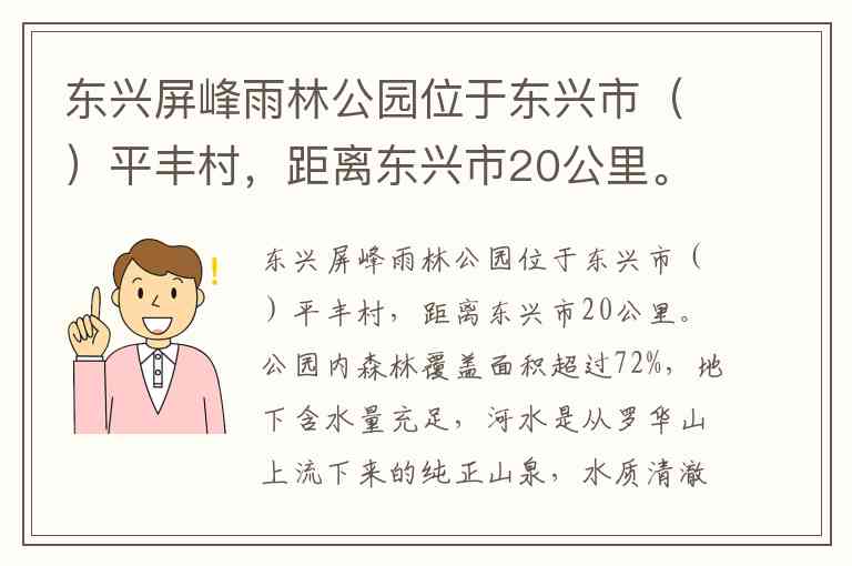 东兴屏峰雨林公园位于东兴市()平丰村,距离东兴市20公里。公园内森林覆盖面积超过72%,地下含水量充足,河水是从罗华山上流下来的纯正山泉,水质清澈,富含矿物质及对皮肤有益的微量元素。 A. 马路镇 B. 江平镇 C. 峒中镇 D. 企沙镇