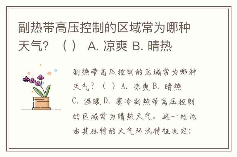 副热带高压控制的区域常为哪种天气?( ) A. 凉爽 B. 晴热 C. 温暖 D. 寒冷