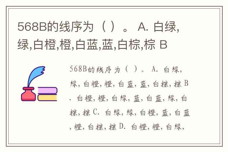 568B的线序为( )。 A. 白绿,绿,白橙,橙,白蓝,蓝,白棕,棕 B. 白橙,橙,白绿,蓝,白蓝,绿,白棕,棕 C. 白绿,绿,白橙,蓝,白蓝,橙,白棕,棕 D. 白橙,橙,白绿,绿,白蓝,蓝,白棕,棕 F. B