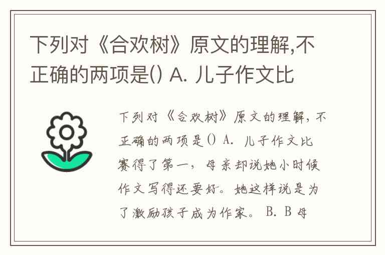 《合欢树》中对母爱的刻画细腻而克制,部分选项对原文情感与细节的解读存在偏差。以下两项理解不正确: