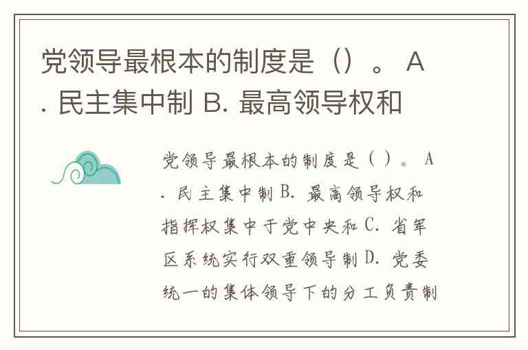 党领导最根本的制度是()。 A. 民主集中制 B. 最高领导权和指挥权集中于党中央和 C. 省军区系统实行双重领导制 D. 党委统一的集体领导下的分工负责制