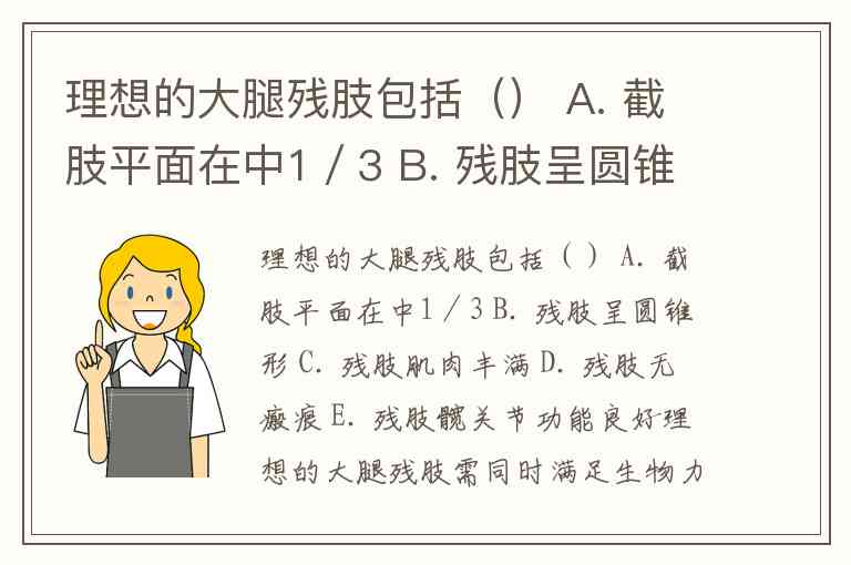 理想的大腿残肢包括() A. 截肢平面在中1/3 B. 残肢呈圆锥形 C. 残肢肌肉丰满 D. 残肢无瘢痕 E. 残肢髋关节功能良好