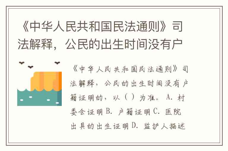 《中华人民共和国民法通则》司法解释,公民的出生时间没有户籍证明的,以()为准。 A. 村委会证明 B. 户籍证明 C. 医院出具的出生证明 D. 监护人描述