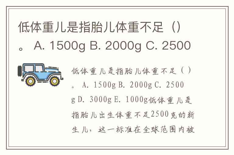 低体重儿是指胎儿体重不足()。 A. 1500g B. 2000g C. 2500g D. 3000g E. 1000g