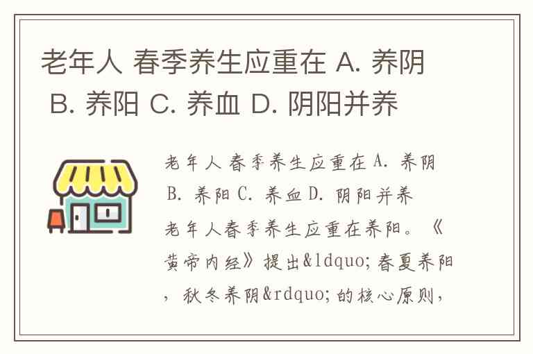 老年人 春季养生应重在 A. 养阴 B. 养阳 C. 养血 D. 阴阳并养