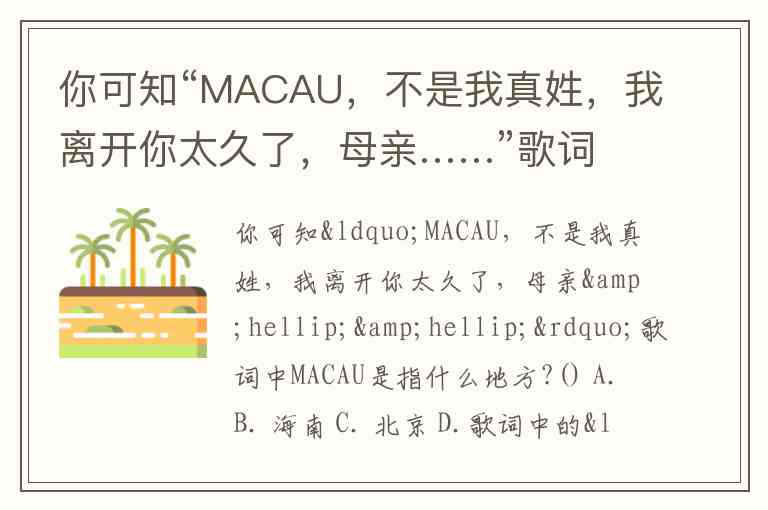 你可知“MACAU,不是我真姓,我离开你太久了,母亲……”歌词中MACAU是指什么地方?() A. B. 海南 C. 北京 D.
