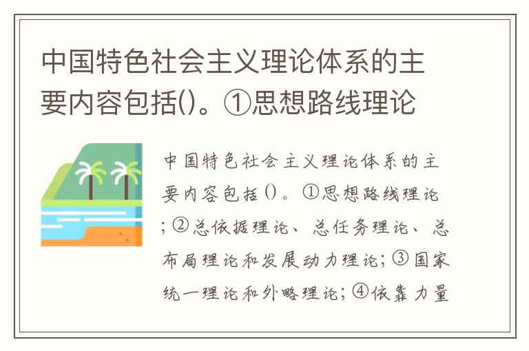 中国特色社会主义理论体系的主要内容包括()。①思想路线理论;②总依据理论、总任务理论、总布局理论和发展动力理论;③国家统一理论和外略理论;④依靠力量理论和领导核心理论。 A. ①②④ B. ①②③ C. ①②③④ D. ①③④
