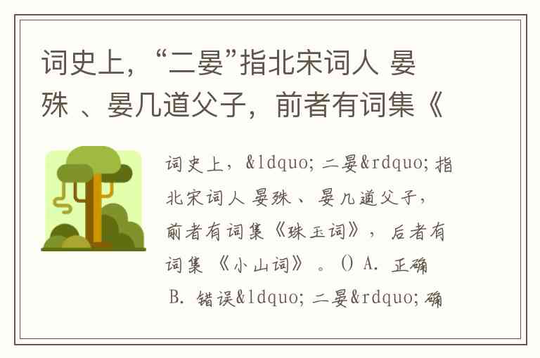 词史上,“二晏”指北宋词人 晏殊 、晏几道父子,前者有词集《珠玉词》,后者有词集 《小山词》 。() A. 正确 B. 错误