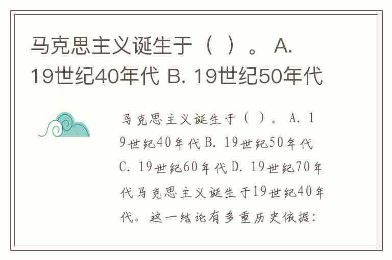 马克思主义诞生于( )。 A. 19世纪40年代 B. 19世纪50年代 C. 19世纪60年代 D. 19世纪70年代