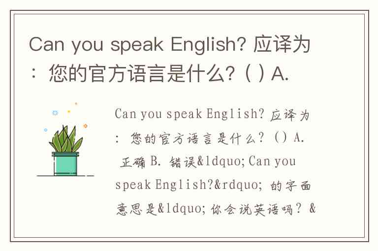 “Can you speak English?” 的字面意思是“你会说英语吗?”,而“您的官方语言是什么?”对应的英文应该是“What is your official language?”。两者询问的内容完全不同,前者关注对方是否具备说英语的能力,后者则是询问官方规定的语言种类。因此,该翻译是错误的。