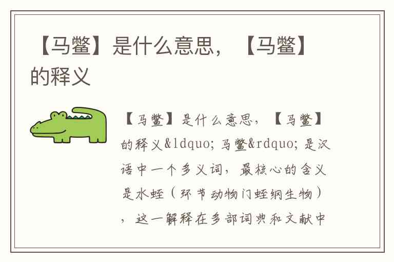 值得注意的是,“马鳖”作为水蛭的别名具有明确的文献依据,可追溯至明代李时珍的《本草纲目·虫二·水蛭》,而形容人迟钝的用法更接近口语中的比喻性表达,未形成广泛认可的成语规范。实际使用中,需根据上下文判断具体含义——在自然科学、户外活动或医学场景中,通常指生物水蛭;在非正式口语中,可能隐含对他人反应能力的负面评价。你是否在特定场景中遇到这个词,需要进一步区分其含义?