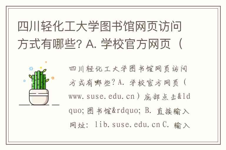 四川轻化工大学图书馆网页访问方式有哪些? A. 学校官方网页(www.suse.edu.cn)底部点击“图书馆” B. 直接输入网址:lib.suse.edu.cn C. 输入IP地址:61.139.105.141