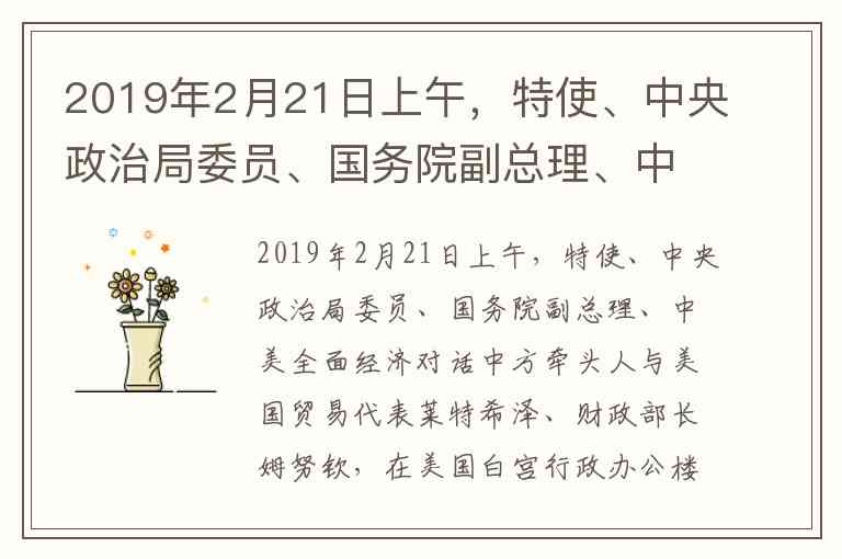 2019年2月21日上午,习近平主席特使、中共中央政治局委员、国务院副总理、中美全面经济对话中方牵头人刘鹤与美国贸易代表莱特希泽、财政部长姆努钦,在美国白宫艾森豪威尔行政办公楼共同主持第七轮中美经贸高级别磋商开幕式。这一信息可从新华社当时的权威报道中得到明确印证,该轮磋商原定21-22日举行,实际持续至24日,双方在技术转让、知识产权保护等多个议题上取得实质性进展。