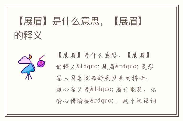 “展眉”是形容人因喜悦而舒展眉头的样子,核心含义是“眉开眼笑,比喻心情愉快”。这个汉语词汇由动词“展”(舒展)和名词“眉”(眉毛)组成,通过描绘面部表情变化来反映内心状态,结构简洁却极具画面感。